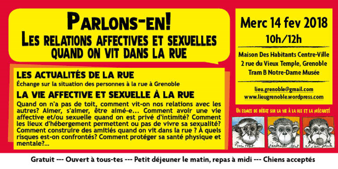 L'hiver approche, et avec lui comme chaque année la question des hébergements pour les personnes à la rue. Lieux d'hébergement, d'alimentation, de vie, de soin, d'hygiène, de luttes, de rencontres, d'entraide, de soins... Sans lieu, comment survivre? Quels sont "nos" lieux dans la ville? Comment on s'organise pour les revendiquer/les créer/les tenir? Quels sont les lieux manquants?